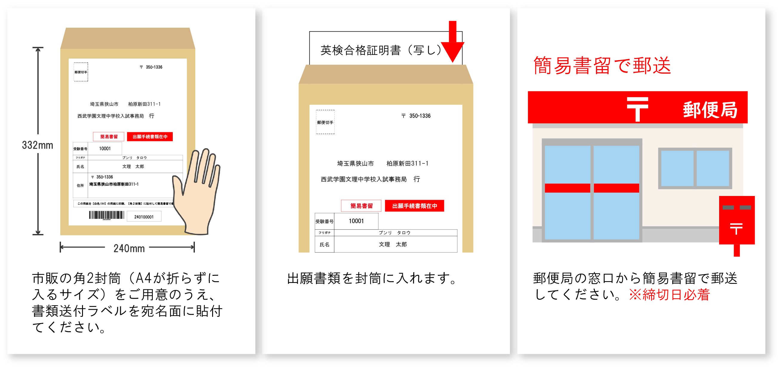 代替入試への振り替えを希望される場合は、出願している各入学試験当日の8:30までに、入試事務局(04-2954-4080)まで必ずお電話にてご連絡のうえ、以下の書類を本校宛に郵送にてご提出ください。