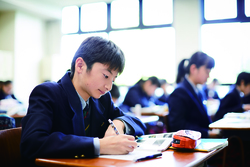 カリキュラムに関しては、中学3年間の主要3教科の週あたりの授業時間は、英語16時間(公立11 時間)、数学13.5時間(公立11 時間)、国語12時間(公立11 時間)。主要科目にしっかりと時間を割り当て無理なくきちんと基礎学力を定着させます。中学3年からは応用力養成期間に入り、高校レベルの学習内容を意識した授業となります。