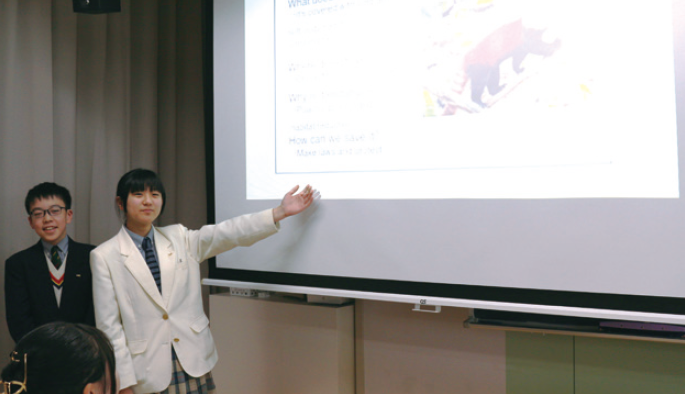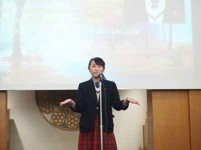 毎年、中学生全員が英語スピーチコンテストに参加します。生徒たちは自分でオリジナルのスピーチを書き、クラスのスピーチコンテストで全員がスピーチを行います。優秀なスピーチは11月に全校生徒の前で発表を行い、優勝者が決まります。この英語スピーチコンテストは、全生徒に英語で自己表現する機会を与え、同時に英語を話す自信をつけさせます。