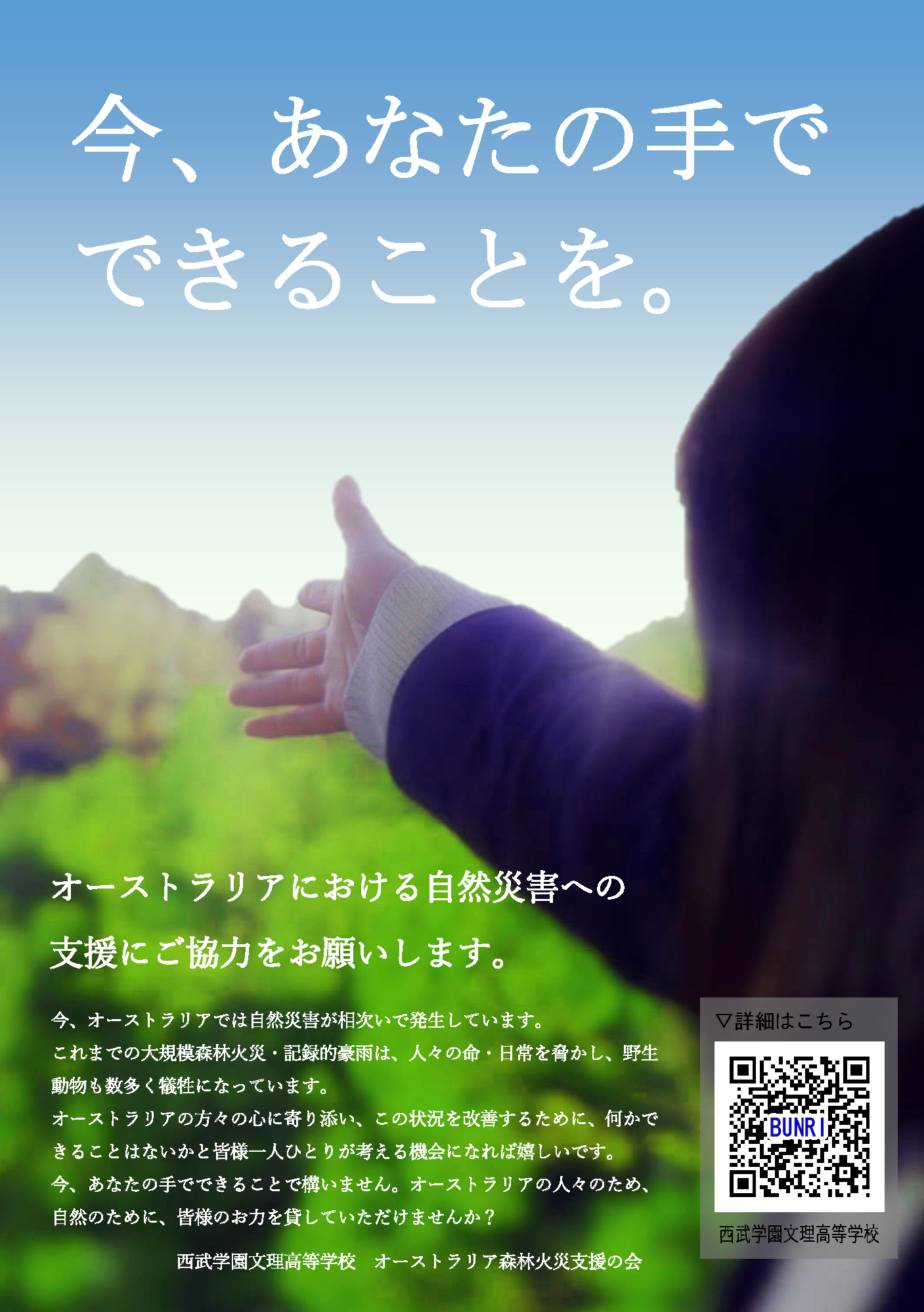 現在、オーストラリアにて大規模な森林火災が発生しており、人々や動物の生命を奪い、甚大な被害が生じています。オーストラリアは、本校英語科の語学研修先、また、普通科の研修旅行先になっており、英語科の有志生徒8名が、この状況を支援するための組織を立ち上げました。本校としても生徒の意向を尊重し、支援の方法の一つとして募金活動を始めました。つきましては、趣旨をご理解のうえ、ご協力いただければ幸いです。