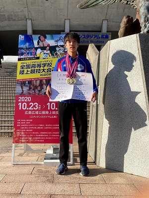 10月24日(土)・25日(日)に全国高等学校陸上競技大会2020がエディオンスタジアム広島にて開催されました。三輪 颯太さん(3B3)が男子100m・200mに出場し、2種目優勝、全国大会2冠を達成しました。