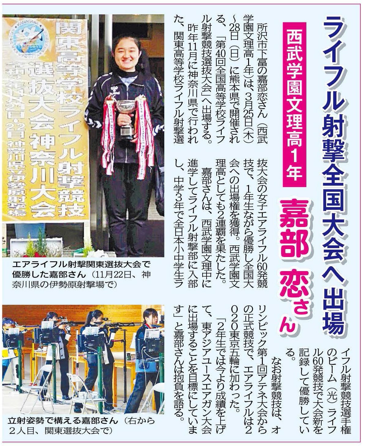 昨年の関東選抜大会の優勝、所沢市スポーツ賞の受賞を受け、ライフル射撃部の嘉部 恋さん(1-B3)のインタビュー記事が、市民新聞(2021年3月4日付 4面)に掲載されました。