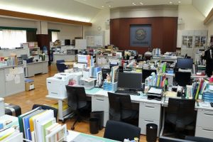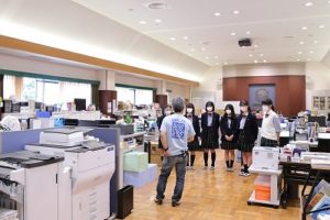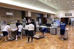 初回は、収録現場の見学でした。本校のサイエンスホールを職員室に仕立てての収録で、備品の多くはTBS緑山スタジオから運ばれてきました。スタッフの方が机を並べたり、美術の小道具担当者が机上に備品を並べたり、ロッカーにラベルを貼っていきます。今まで集会で利用していたホールが1日で職員室へと変化していきます。その完成度の高さと美術担当者のこだわりを生徒たちは実感していました。