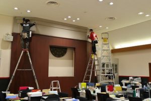 2回目は、収録後にスタッフと協力して片付けの体験です。次の収録日まで時間があるので、一度、原状復帰の作業を行い、その仕事を体験しました。次回の収録時には、すべての備品を同じ位置に配置するために、床にテープで目印をつけておき、机上の備品を写真に撮り、段ボールに詰めます。机は後方にまとめて、元のホールへと戻しました。