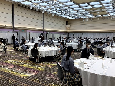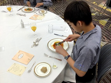 ウォークラリーでお腹をすかせた生徒たちは12:00前には川越プリンスホテルへ。ホテル側のご配慮で、座席は十分にスペースがとられた上、アクリル板で仕切られ、感染防止の対策がしっかり整っていたため、安心して食事ができました。生徒たちは、フランス料理に舌鼓を打ちながら、ナイフやフォークの持ち方、ナプキンの使い方、料理の食べ方、会話のしかたなどを学びました。コロナ禍とあって「黙食」となりましたが、講師の先生からは聞く態度が素晴らしかったとお褒めの言葉をいただきました。