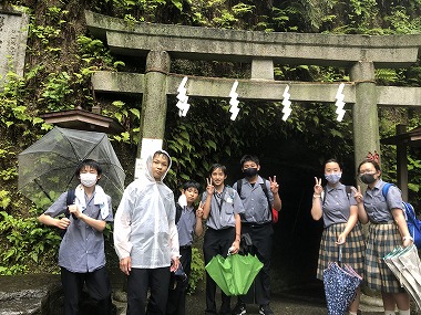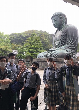 学校からバスで一路、鎌倉へ。鶴岡八幡宮に到着すると、そこからは班行動です。各班で選んだコースに沿って、鎌倉の寺社を巡り、日本の文化や歴史に触れました。時折、風雨が強まり、軒先を借りて雨宿りする班も見られましたが、昼食場所である高徳院(鎌倉大仏)にはみんな笑顔で到着。雨ニモ負ケズ 風ニモ負ケズ。昼食後も、予定どおりの見学コースをたどって、全員無事にゴールの鶴岡八幡宮に戻ってこられました。