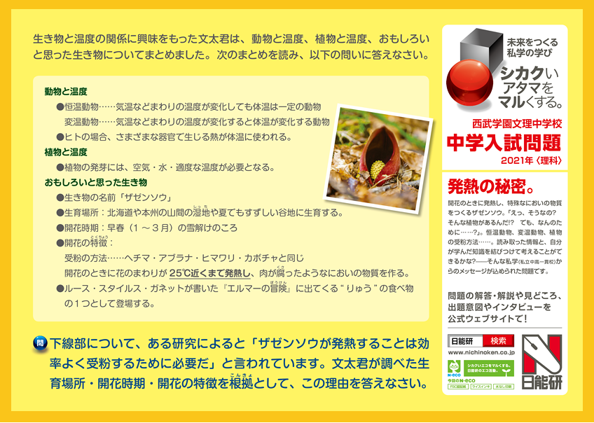 電車内広告でおなじみの「シカクいアタマをマルくする(日能研)」に本校が2021年1月10日第1回入試に実施した【理科】(大問3~問5)の入試問題が選ばれ、2021年5月20日~2021年6月19日までの1ヶ月間電車内に掲出されましたことを、5月24日にホームページにてご案内いたしましたが、同問題を作問した本校理数科長 加藤礼のインタビュー記事が日能研の公式ウェブサイトにて公開されました。是非、ご覧ください。