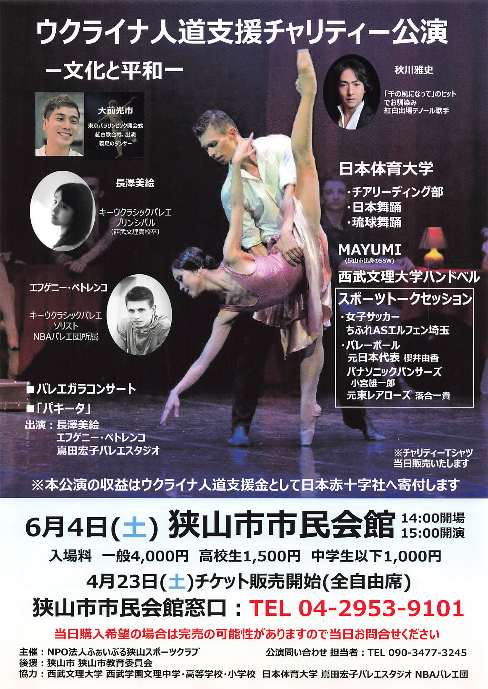 6月4日(土)、ウクライナ キーウ クラシックバレエ団に所属している本校卒業生(高校21期)長澤美絵さんが狭山市民会館 大ホール『ウクライナ人道支援チャリティー公演』を行うことになりました。