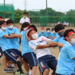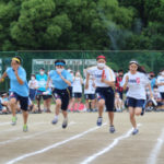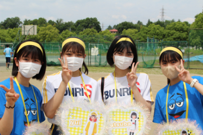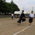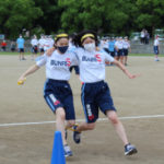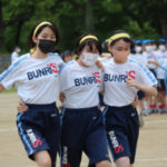 3年生女子の旗体操で幕を開けた体育祭は、クラス対抗リレーや選抜リレーといった緊張感あふれる種目の他、「背中渡りリレー」「台風の目」「綱引き」など、チーム力を問われる種目で大盛り上がり。4色の応援団が繰り広げるダンスには、スタンドから大きな拍手が起こりました。そして、最後は、各クラブが色とりどりの装いで出場するクラブ対抗リレー。男女とも陸上部が実力を見せつける一方、空手部はバトンのたびに「板割り」を披露し、おおいに会場を沸かせました。第3学年の教員陣も飛び入り参加。生徒たちからは大きな声援が寄せられました。