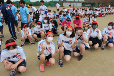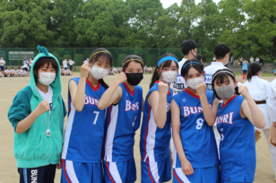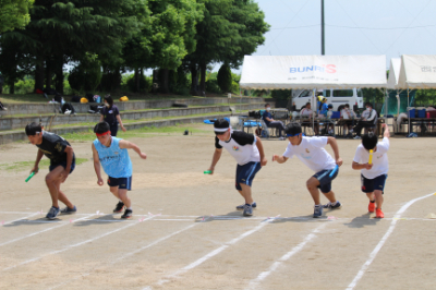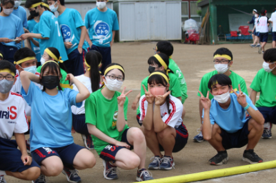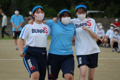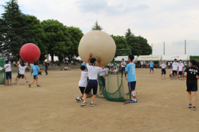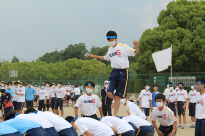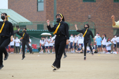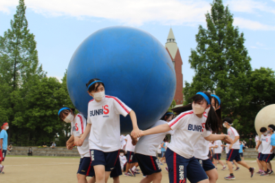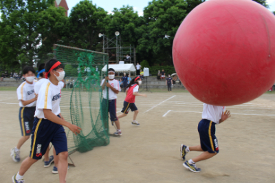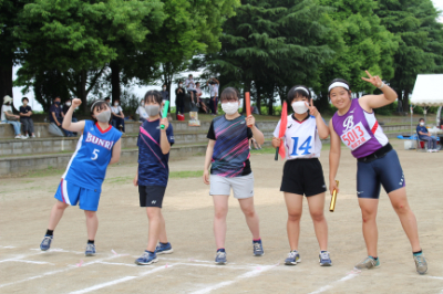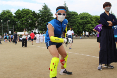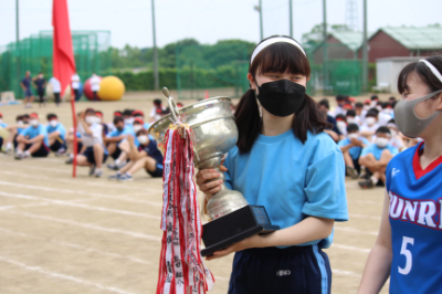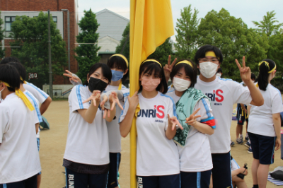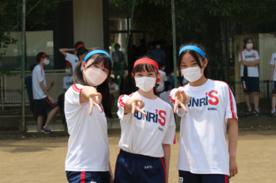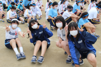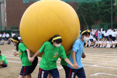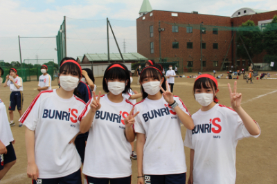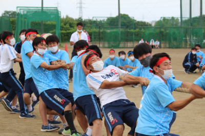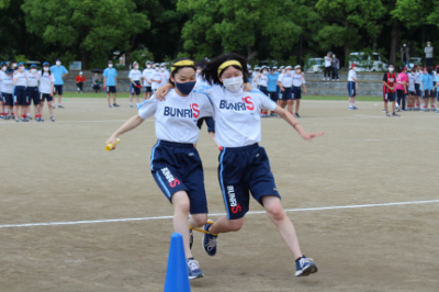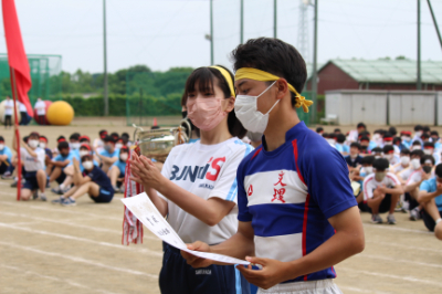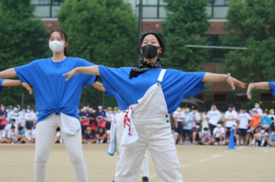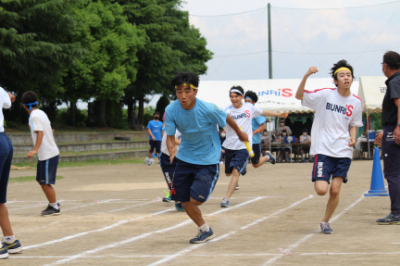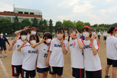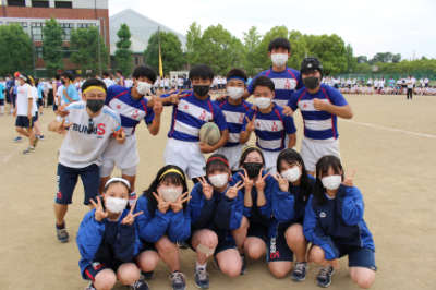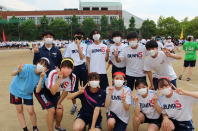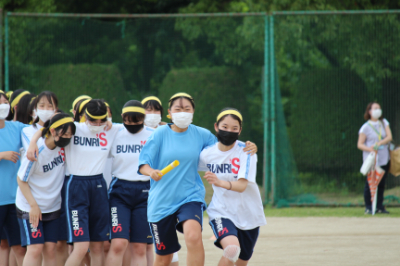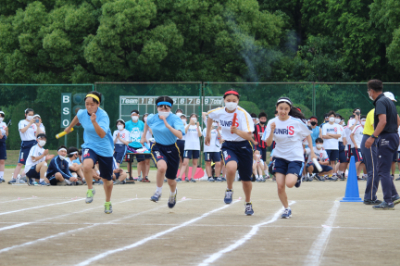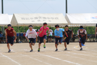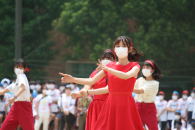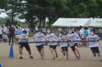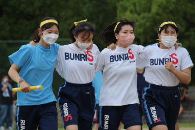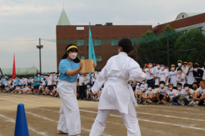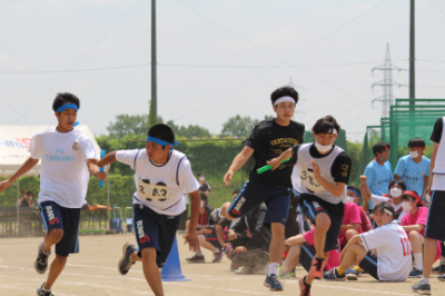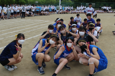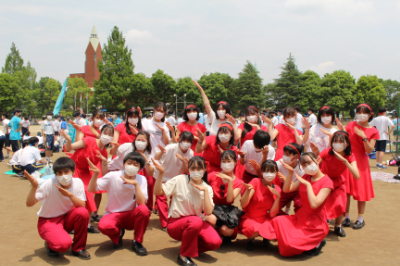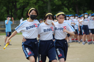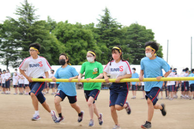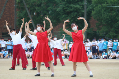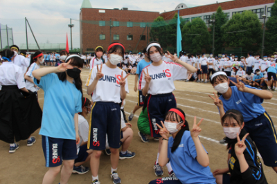 3年生女子の旗体操で幕を開けた体育祭は、クラス対抗リレーや選抜リレーといった緊張感あふれる種目の他、「背中渡りリレー」「台風の目」「綱引き」など、チーム力を問われる種目で大盛り上がり。4色の応援団が繰り広げるダンスには、スタンドから大きな拍手が起こりました。そして、最後は、各クラブが色とりどりの装いで出場するクラブ対抗リレー。男女とも陸上部が実力を見せつける一方、空手部はバトンのたびに「板割り」を披露し、おおいに会場を沸かせました。第3学年の教員陣も飛び入り参加。生徒たちからは大きな声援が寄せられました。