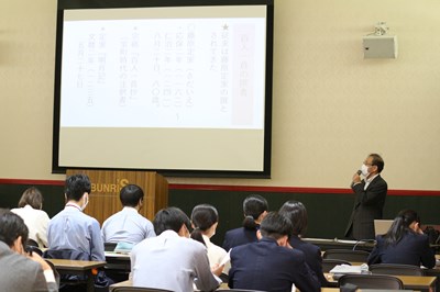31日(月)には、都留文科大学文学部教授・佐藤明浩先生に来校いただき、ご講演いただきました。「『百人一首』を読む―〈ちはやふる〉歌の解釈」と題された講演は、『百人一首』が藤原定家の撰ではないという説から始まり、推理小説を読んでいるかのように、時代背景や人物関係をひもときながら、和歌の解釈へと迫っていきました。参加したおよそ30人の高校生もメモを走らせながら先生の話を熱心に聞いていました。