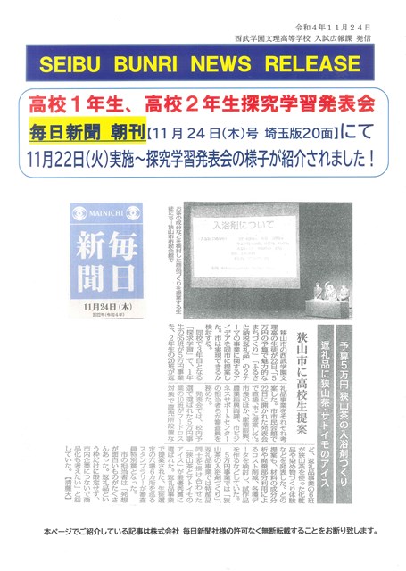令和4年11月22日(火)に、狭山市民会館にて高校1、2年生合同の探究学習発表会が開催されました。その様子が、11月24日(木)の毎日新聞朝刊にて取り上げられました。
