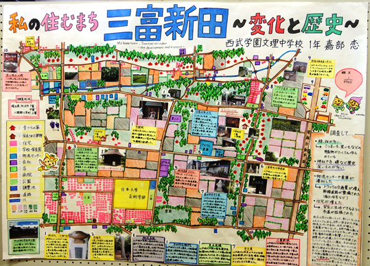 中学校の地理「身近な地域の調査」という単元では、地域の情報を集め、調査し、地図で表現して発表する取り組みを行っています。