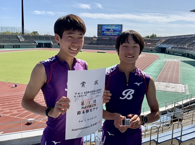 | 競技場スタンドから県大会入賞者の記念写真 (左から鈴木さん、原さん) |