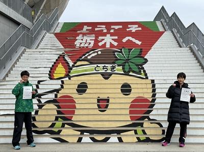 | スタジアム内で記念撮影 | (左から)鈴木さん、とちまるくん、原さん 【注】とちまるくんは「栃木県マスコットキャラクター」 |