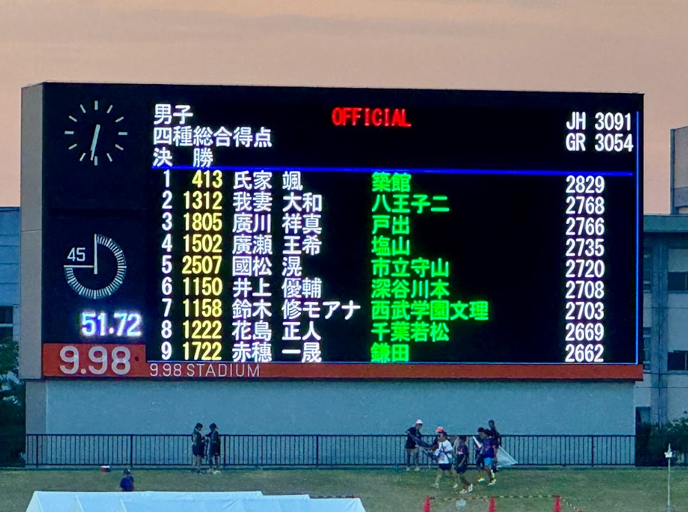 四種のうち前半2種目はどちらも自己新記録の全体3位で折り返すも、3種目目の走高跳は自己記録より6cm低い高さ…ここまで10日前の関東大会と同じ流れ、関東大会は最後の400mもあまりよくない記録でした。しかし、関東の反省を活かし、全国大会では最後の400mを52秒76の自己新記録(1秒以上も新記録)で走り、全国7位!本校として全国入賞は9年ぶり2回目です。