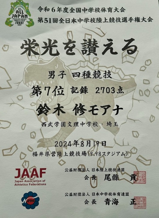 令和6年8月17日(土)~8月20日(火)に【福井県】9.98スタジアム(福井県営陸上競技場)で開催された「令和6年度 全国中学校体育大会 第51回 全日本中学校陸上競技選手権大会」において、鈴木修モアナさん(3-4)が男子四種競技で7位入賞しました!
