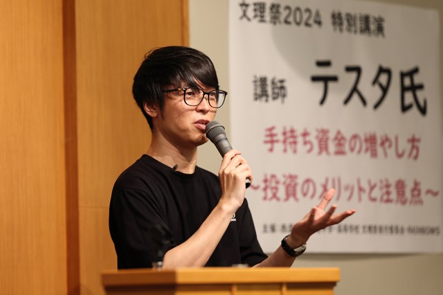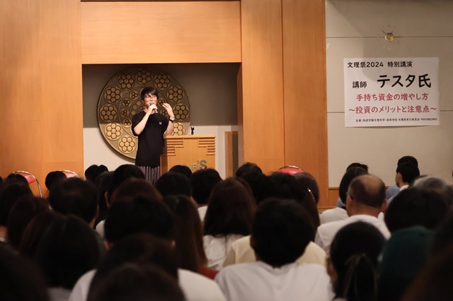文理祭初日の9月7日(土)に、個人投資家のテスタさんをお招きし、金融教育講座を実施しました。「手持ち資金の増やし方 ~投資のメリットと注意点~」というテーマで設定したところ、事前の申し込みで予想を遥かに越える応募者があり、大ホールに変更しての実施となりました。