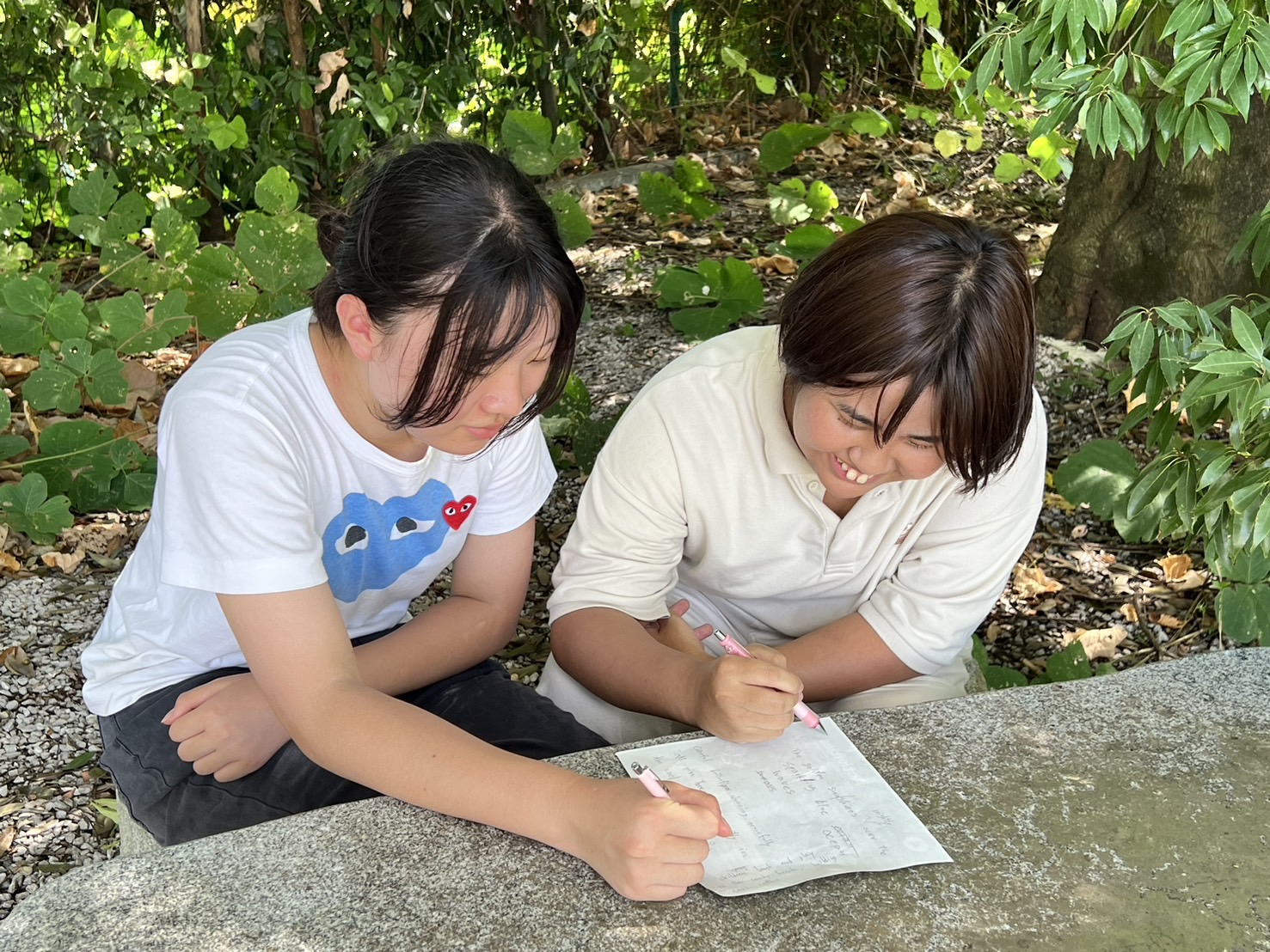 2つのチームが、敷地内に隠された文を見つけて自分のチームに伝え、そのチームメンバーが相手チームと競って伝えられた文を書き上げるレースを行いました。