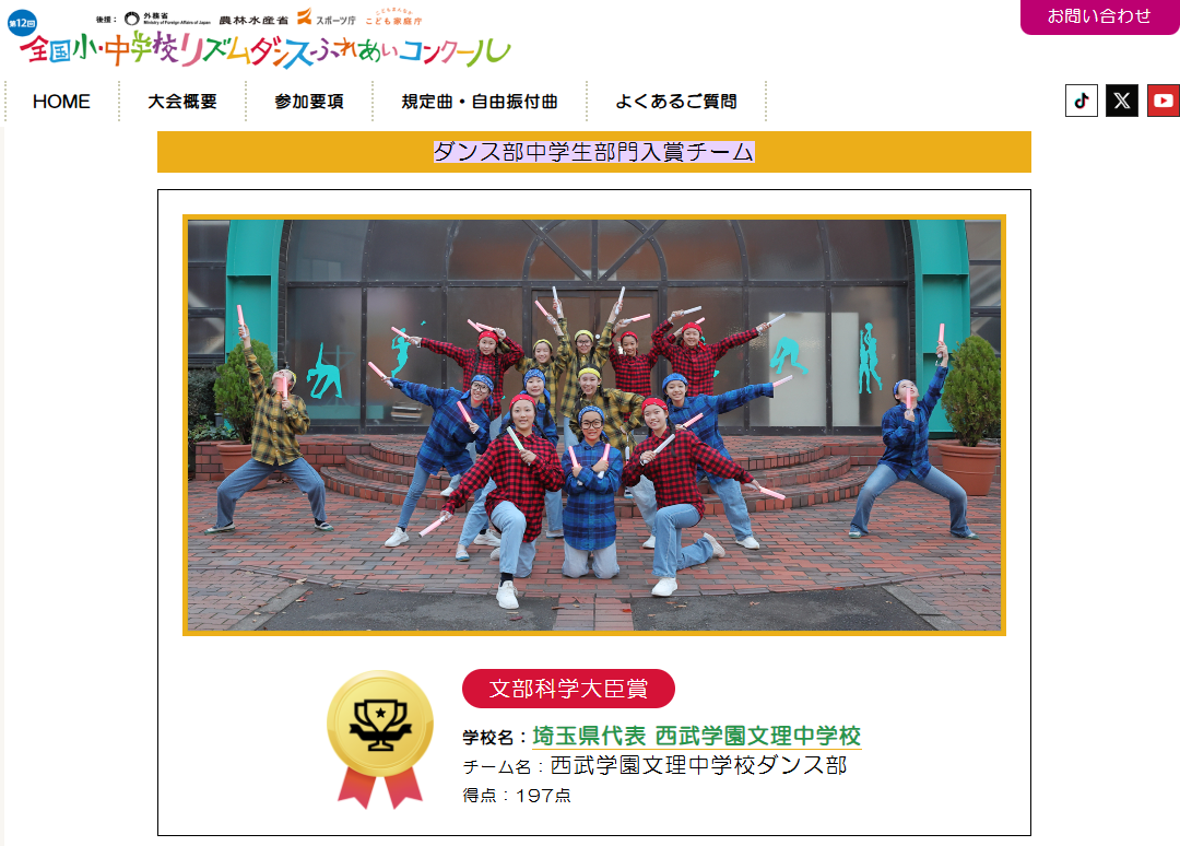 2024年12月26日(木)にオンラインにて開催された「第12回 全国小・中学校リズムダンスふれあいコンクール ダンス部中学生部門」において、西武学園文理中学校 中学ダンス部が「文部科学大臣賞」を受賞しました。