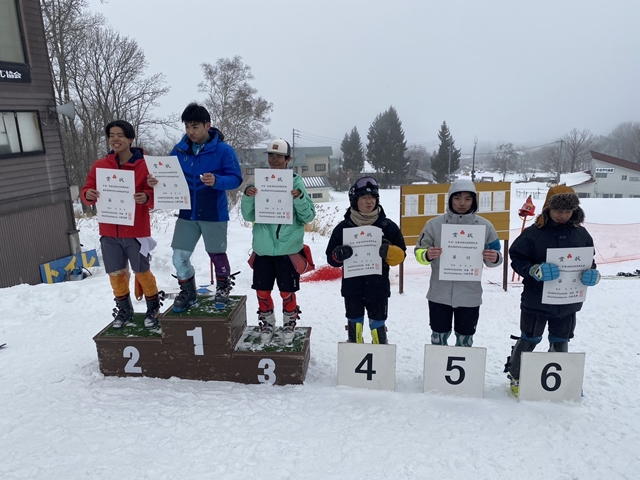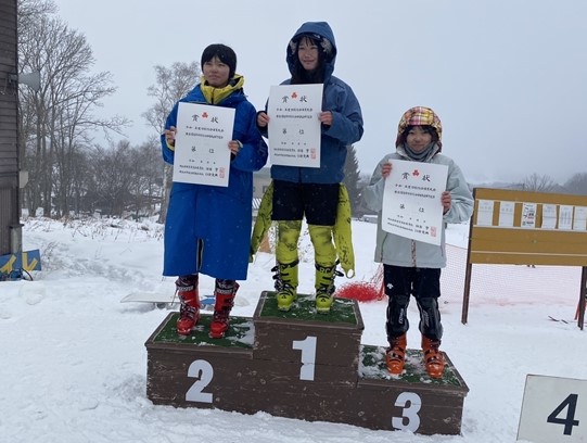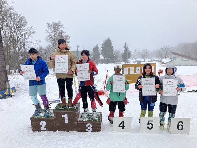 男子回転競技の表彰 4位早川さん、6位鈴木さん   男子学校対抗の表彰 1位文理高校(部長の本間さん)