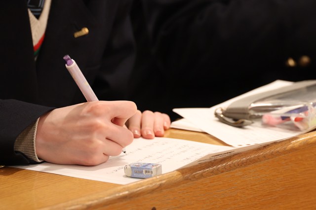 本校の高等学校への進学条件の1つである卒業論文の制作は、自分でテーマを設定し、1年生から調査・実験を繰り返して仕上げる中学3年間の集大成です。クラス発表会が2月5日(水)~7日(金)に行われ、各クラス2名のクラス代表者が中学全校生徒の前で1人7分の持ち時間の中で発表を行いました。自ら考察した内容を時間内にまとめ発表することにより、自分の考えを要約し伝える力・プレゼンテーション能力の向上に役立っています。司会やタイムキーパーも生徒で行い、発表会を運営しました。