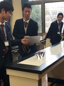 | 理数科1年生 3 チームが出場。それぞれ四足ロボットを製作し、前進、後退、右折、左折などチーム独自の動作をプログラムしました。大会では、直線コースを走り抜けるタイムアタック予選が行われました。出場3チーム中、1チーム(チーム Jhonny) が予選を順調に突破。決勝戦ではプログラムで工夫したところを中心としたプレゼンテーションと障害物レースが行われ、見事優勝を収めました。 | |