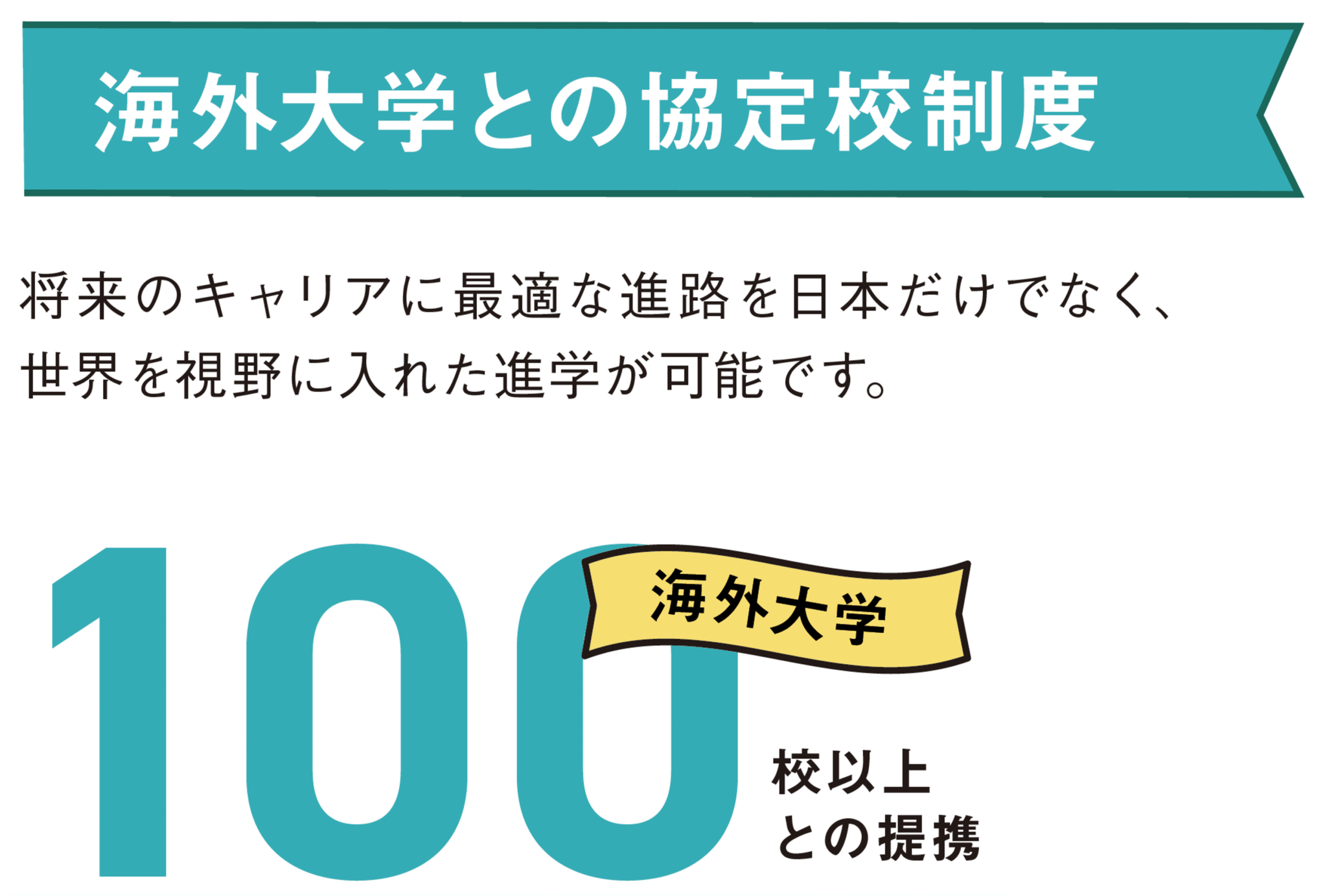 海外大学への協定校推薦制度を導入。生徒の進路希望が海外大学にある場合、よりスムーズに進学することができるサポート体制を整えています。海外の大学には日本で学べない分野も数多くあり、生徒の様々な希望に応えられるよう、進路指導部と連携しながら生徒に寄り添った進路指導を行っています。